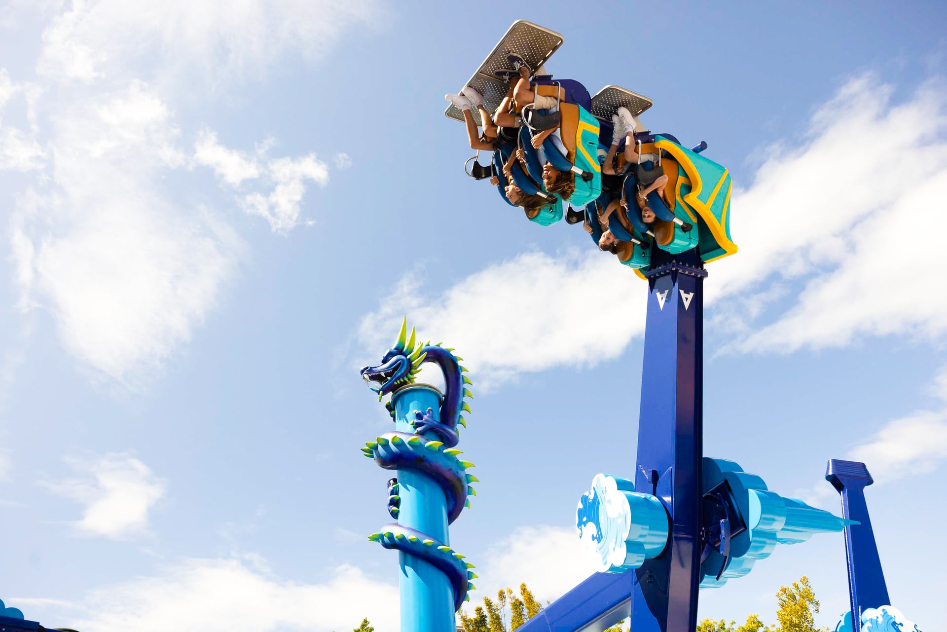 Here, The Gold Coaster barrels through like a mighty wave, Tail Spin twists up above, and Serpent Slayer swings alongside the sandy-toed atmosphere and beach party playlist.